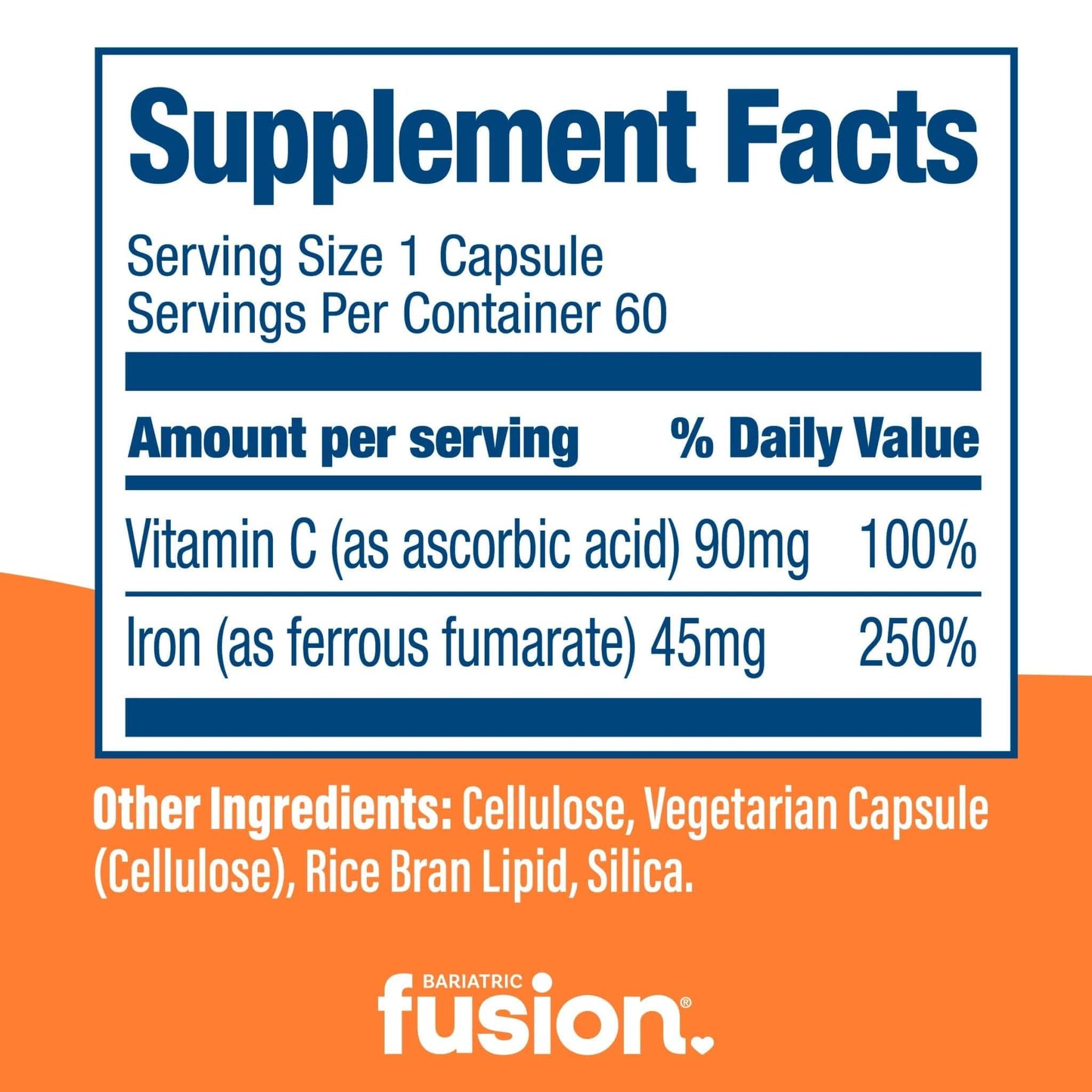 Bariatric Fusion Bariatric Iron Plus Vitamin C Capsules are offered in two iron dosage options: 60mg and 45mg. These products provide flexibility to cater to individual requirements, aligning with the American Society for Metabolic and Bariatric Surgery guidelines. Our bariatric iron supplement may also be used by those experiencing iron deficiency anemia under the guidance of a healthcare professional.