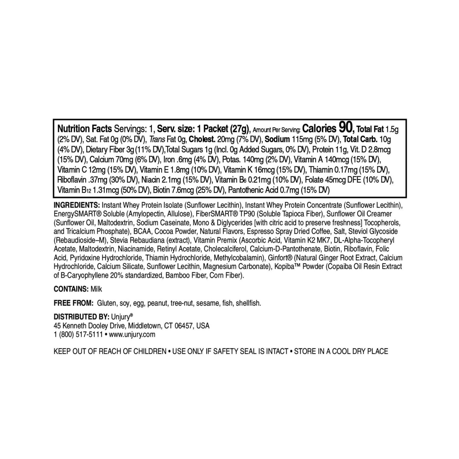 Instant Whey Protein Isolate (Sunflower Lecithin), Instant Whey Protein Concentrate (Sunflower Lecithin), EnergySMART® Soluble (Amylopectin, Allulose), FiberSMART® TP90 (Souble Tapioca Fiber), Sunflower Oil Creamer (Sunflower Oil, Maltodextrin, Sodium Caseinate, Mono & Diglycerides [with citric acid to preserve freshness], Tocopherols, and Tricalcium Phosphate), BCAA, Cocoa Powder, Natural Flavors, Espresso Spray Dried Coffee, Salt, Steviol Glycoside (Rebaudioside-M), Stevia Rebaudiana (extract), Vitamin Premix (Ascorbic Acid, Vitamin K2 MK7, DL-Alpha-Tocopherol Acetate, Maltodextrin, Niacinamide, Retinyl Acetate, Cholecalciferol, Calcium-D-Pantothenate, Biotin, Riboflavin, Folic Acid, Pyridoxine Hydrochloride, Thiamin Hydrochloride, Methylcobalamin), Ginfort® (Natural Ginger Root Extract, Calcium Hydroxide, Calcium Silicate, Sunflower Lecithin, Magnesium Carbonate), Kopiba™ Powder (Copaiba Oil Resin Extract of B-Caryophyllene 20% standardized, Bamboo Fiber, Corn Fiber)