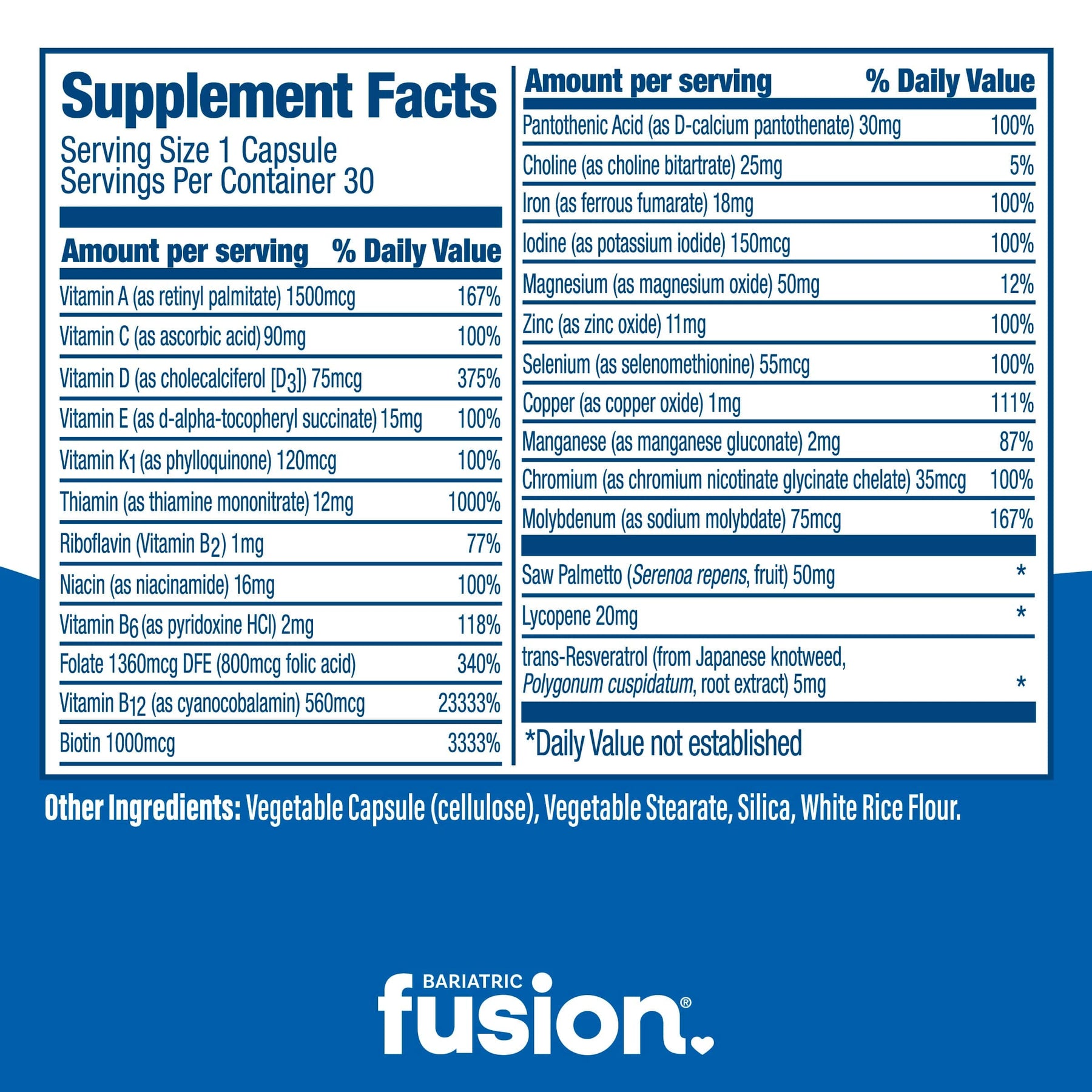 Bariatric Fusion Men’s One Per Day Bariatric Multivitamin Capsule with 18mg Iron provides an easy regimen for men who have undergone bariatric surgery to get their daily bariatric vitamins, including targeted botanicals to address the unique health needs of men. With just one capsule daily, this formula contains biologically available forms of vitamins and minerals to support the absorption of nutrients.*
