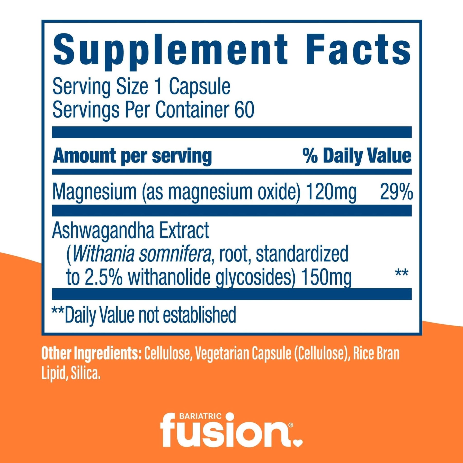 Bariatric Fusion Stress Support* is the first and only stress management supplement for bariatric surgery patients. With just one capsule, once daily with food, this formula provides magnesium and ashwagandha extract to synergistically support a healthy and balanced cortisol response for managing occasional stress and anxiousness.*