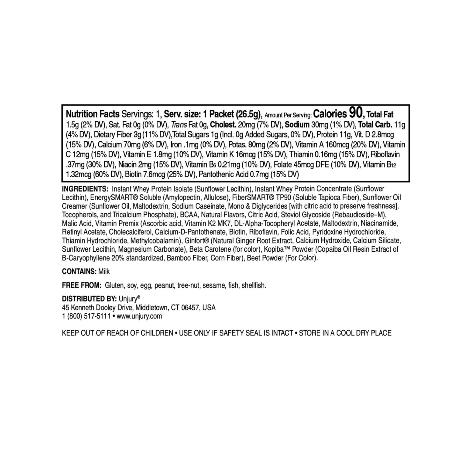 Instant Whey Protein Isolate (Sunflower Lecithin), Instant Whey Protein Concentrate (Sunflower Lecithin), EnergySMART® Soluble (Amylopectin, Allulose), FiberSMART® TP90 (Souble Tapioca Fiber), Sunflower Oil Creamer (Sunflower Oil, Maltodextrin, Sodium Caseinate, Mono & Diglycerides [with citric acid to preserve freshness], Tocopherols, and Tricalcium Phosphate), BCAA, Natural Flavors, Citric Acid, Steviol Glycoside (Rebaudioside-M), Malic Acid, Vitamin Premix (Ascorbic Acid, Vitamin K2 MK7, DL-Alpha-Tocopherol Acetate, Maltodextrin, Niacinamide, Retinyl Acetate, Cholecalciferol, Calcium-D-Pantothenate, Biotin, Riboflavin, Folic Acid, Pyridoxine Hydrochloride, Thiamin Hydrochloride, Methylcobalamin), Ginfort® (Natural Ginger Root Extract, Calcium Hydroxide, Calcium Silicate, Sunflower Lecithin, Magnesium Carbonate), Beta Carotene (for color), Kopiba™ Powder (Copaiba Oil Resin Extract of B-Caryophyllene 20% standardized, Bamboo Fiber, Corn Fiber), Beet Powder (for color) Contains milk