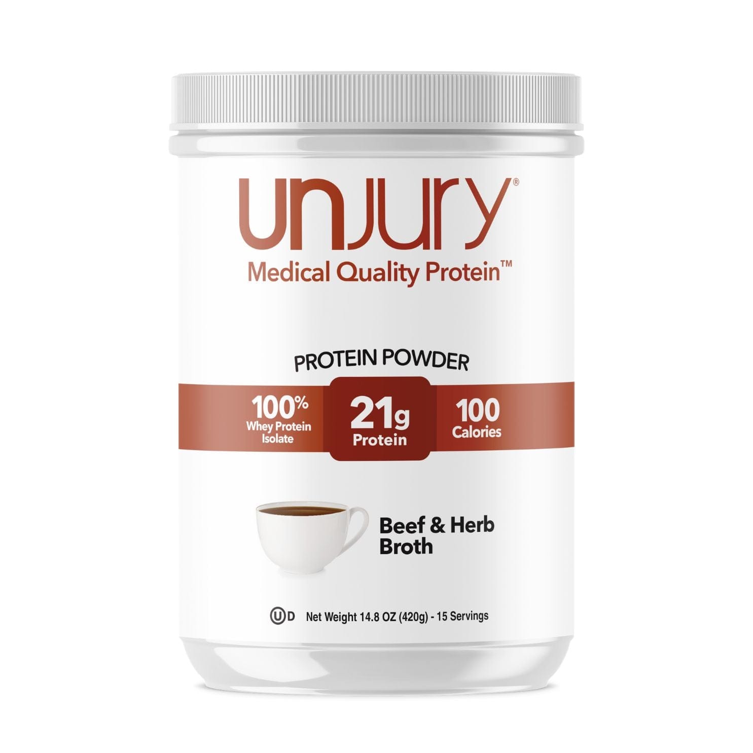 Unjury® Beef and Herb is sure to please! It is a comforting flavor that you know and love - like beef broth, only BETTER! You get the rich, aromatic taste of broth and herbs while getting 21 grams of complete protein — as much protein as 3 eggs or 3 ounces of cooked beef or chicken—without the fat, cholesterol and calories.